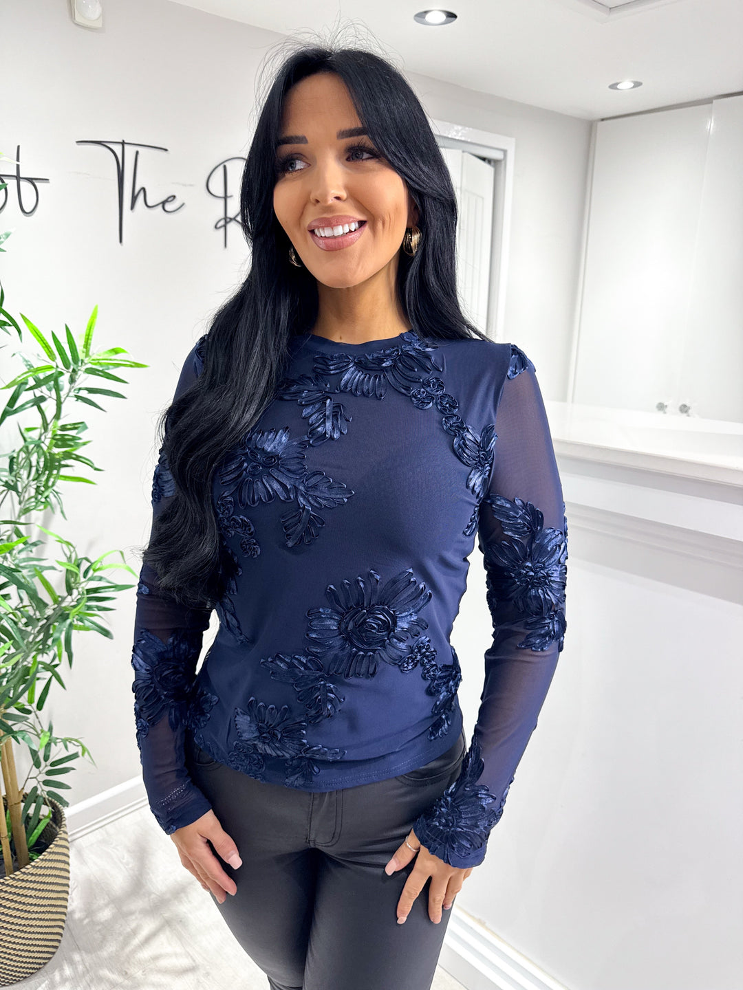 Flower Embroidery Top - Navy